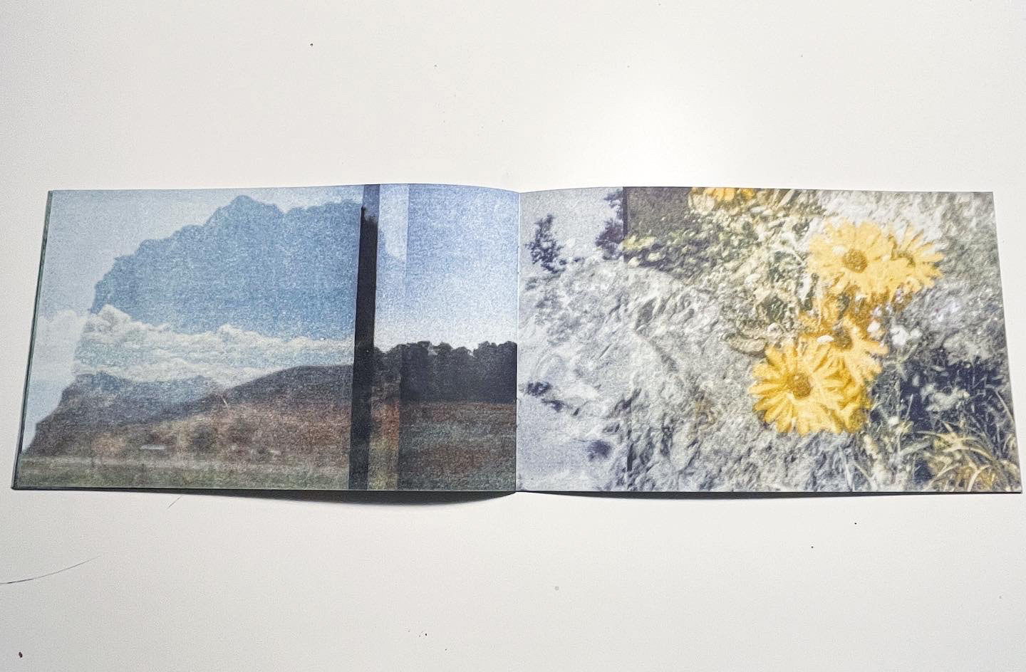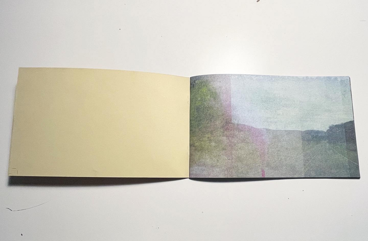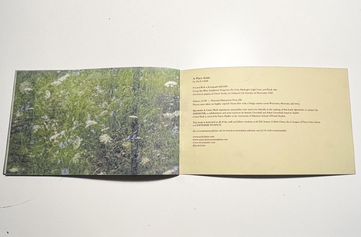 A Place Aside is printed in Sky Blue, Sunflower, Turquoise, Brick, Flo Pink, Light Lime, and Midnight Inks. on French Paper with a Risograph MZ1090, across 24 pages, measuring 8x5", in an edition of 200, October 2022